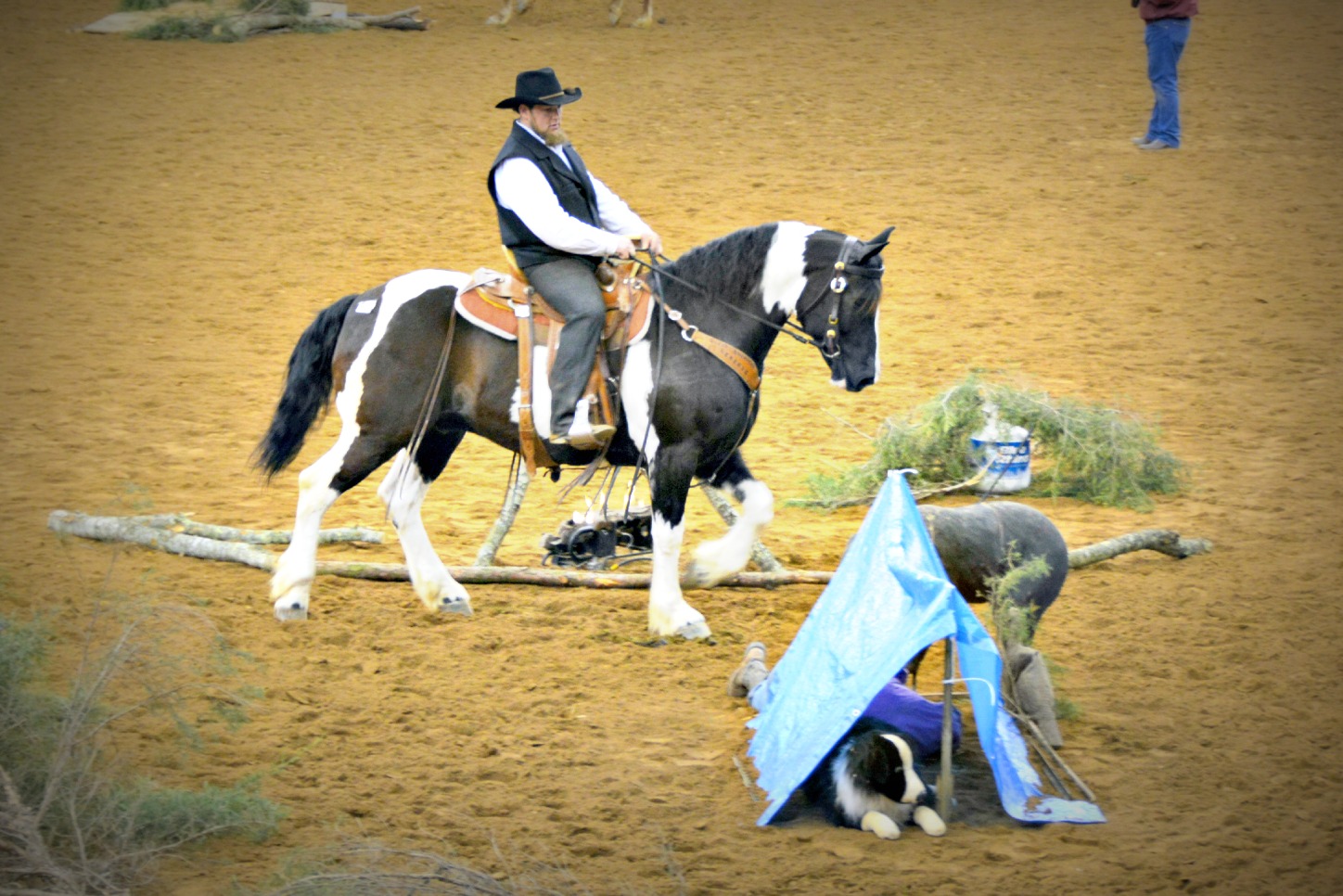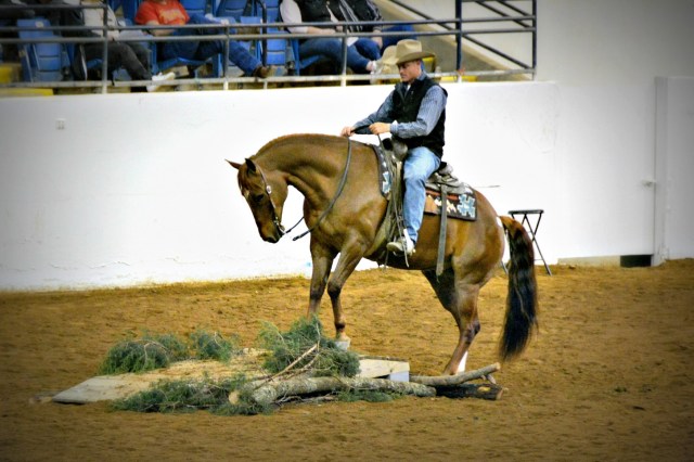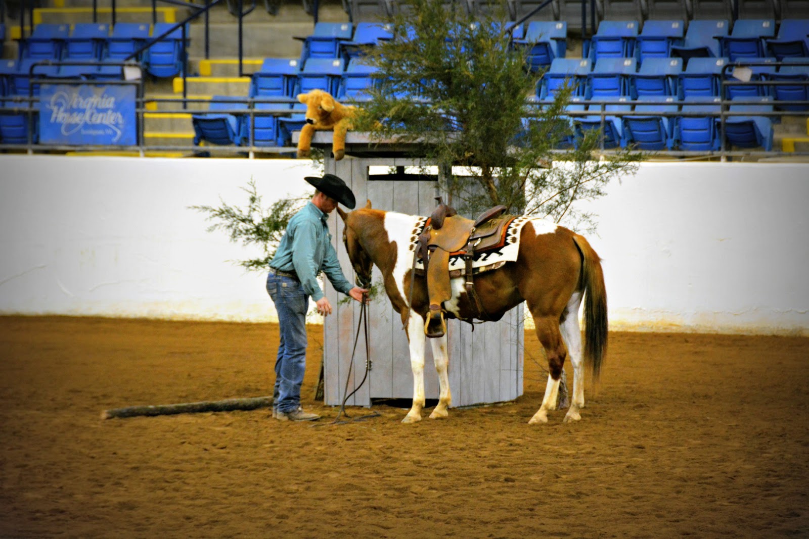 Horses were pitted against a variety of obstacles in the Virginia Horse Center Coliseum just moments after the announcer touted each horse’s various attributes. Talk about walking the walk. Nothing like talking about how well broke a horse is and how he’ll go anywhere as you face off against a wobbly wooden bridge with logs thrown across it as potential bidders look on. Get through that ok? Then a few obstacles later you’ll have to pass a campsite, complete with campfire and fake deer. Thankfully after you cross a path of fallen logs, you’ll find an outhouse to groundtie your mount outside as you go inside. Then, if your horse did indeed wait for you, you throw him on the horse trailer to close the course.