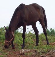 The black Tennessee Walking Horse mare is 18 years old and severely emaciated. The attending veterinarian rated the mare a 1.5 on a body scale of 10. She is 300 pounds underweight and nursing a 5-week-old baby. The foal does not have any obvious conditions but his dam is struggling to produce the amount of milk needed.