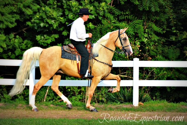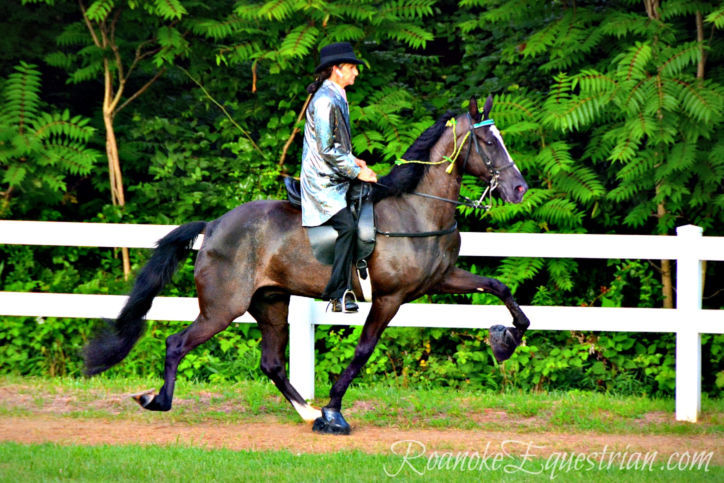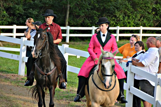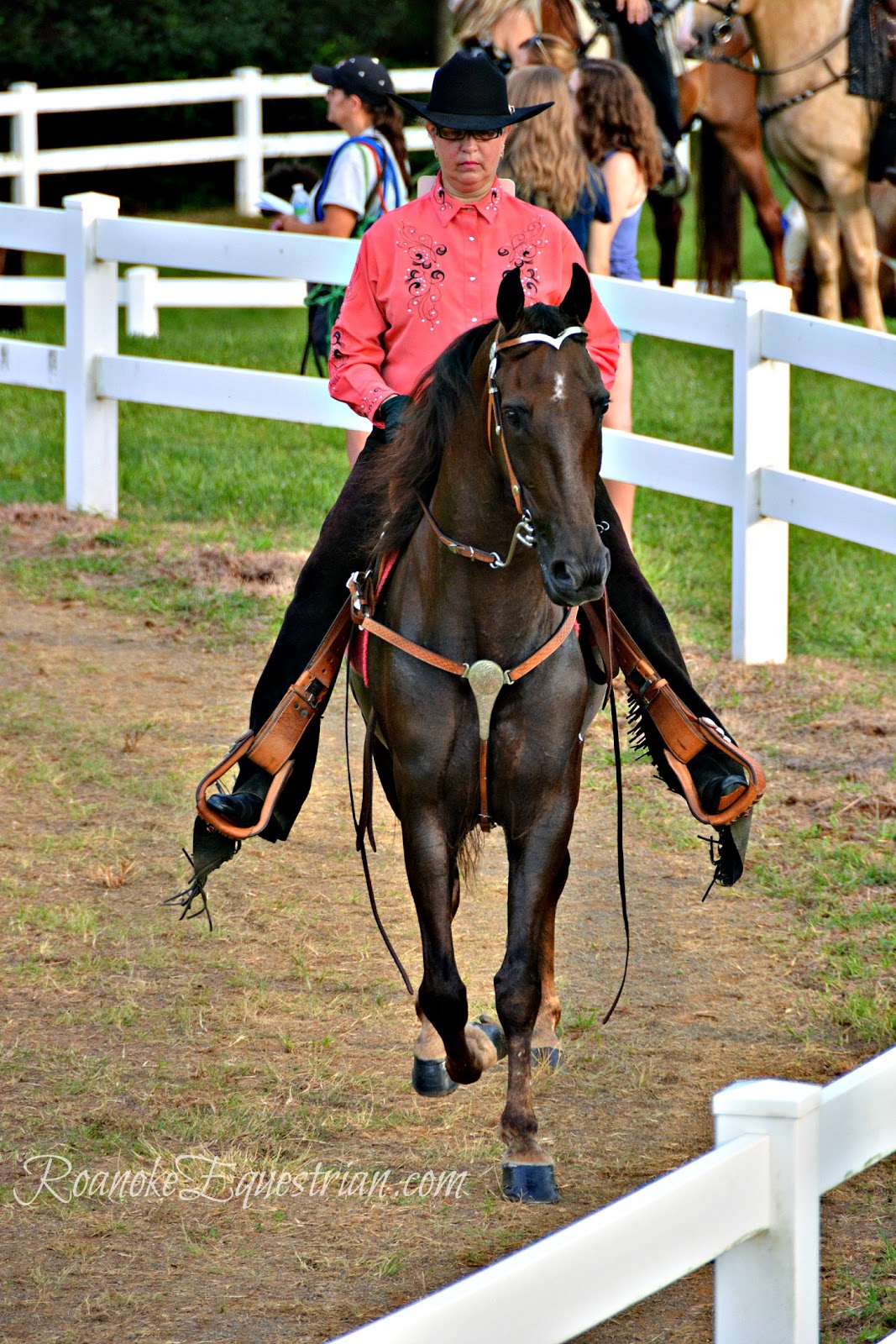 An evening show adds a bit of flair to the classes and the Pine Spur Hunt Club’s version did not disappoint. The classes had a nice variety, although they were geared to the gaited breeds. And the showgrounds is great for spectators. What a wonderful place to spread out a blanket and share a picnic dinner while watching the horses perform. There wasn’t so much as a wisp of dust near the seating area, and the view was excellent from anywhere on the hill. Many spectators sat in lawn chairs or laid on blankets. Others made use of the bleachers set into the hillside. Trees offered shade until the sun went down, and when it did the arena lights came on to add an some dramatic effect to the night. The spectators were very engaged with the action, not a bit shy about calling out their favorites to the judge and the atmosphere was fun and lively. You could feel how much this crowd loved the event and the horses being shown.