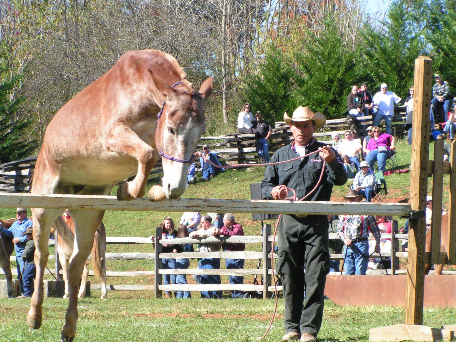 | Unlike horses, mules jump from a standing start. Photo courtesy Blue Ridge Folklife Festival. |