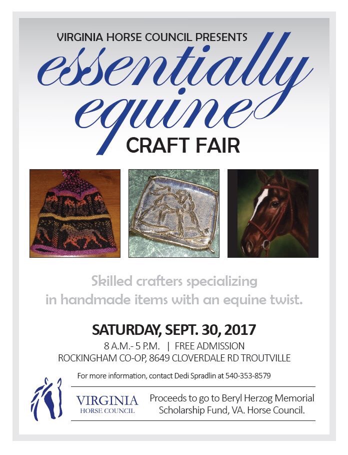 Then be sure to make some time to drive over to Rockingham Co-op on Route 220 South to the Virginia Horse Council’s Essentially Equine Craft Fair. The craft fair will feature area artists’ work but with an equestrian twist. It’s a perfect place to get your early Christmas shopping done for all your horse-loving friends, plus get yourself something special, too. It’s only a 10-minute drive from Hollins if you happen to be showing this weekend. The craft sale will be open from 8 a.m. until 5.
