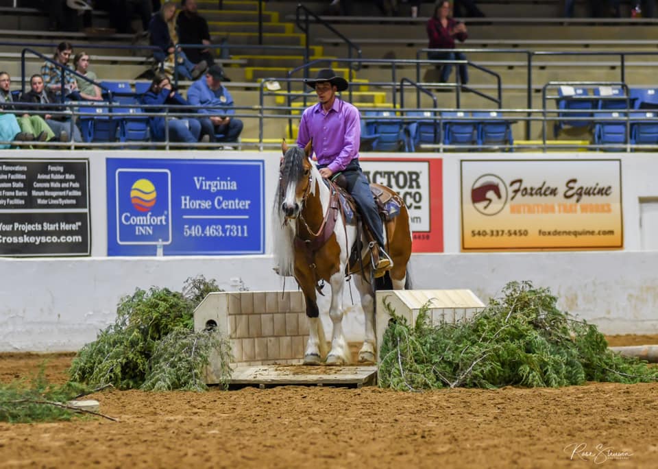 Trail course obstacles include stepping over logs, crossing a bridge, weaving through tree branches, passing a campfire, ground tying while their rider disappears into an outhouse, and loading onto a trailer.